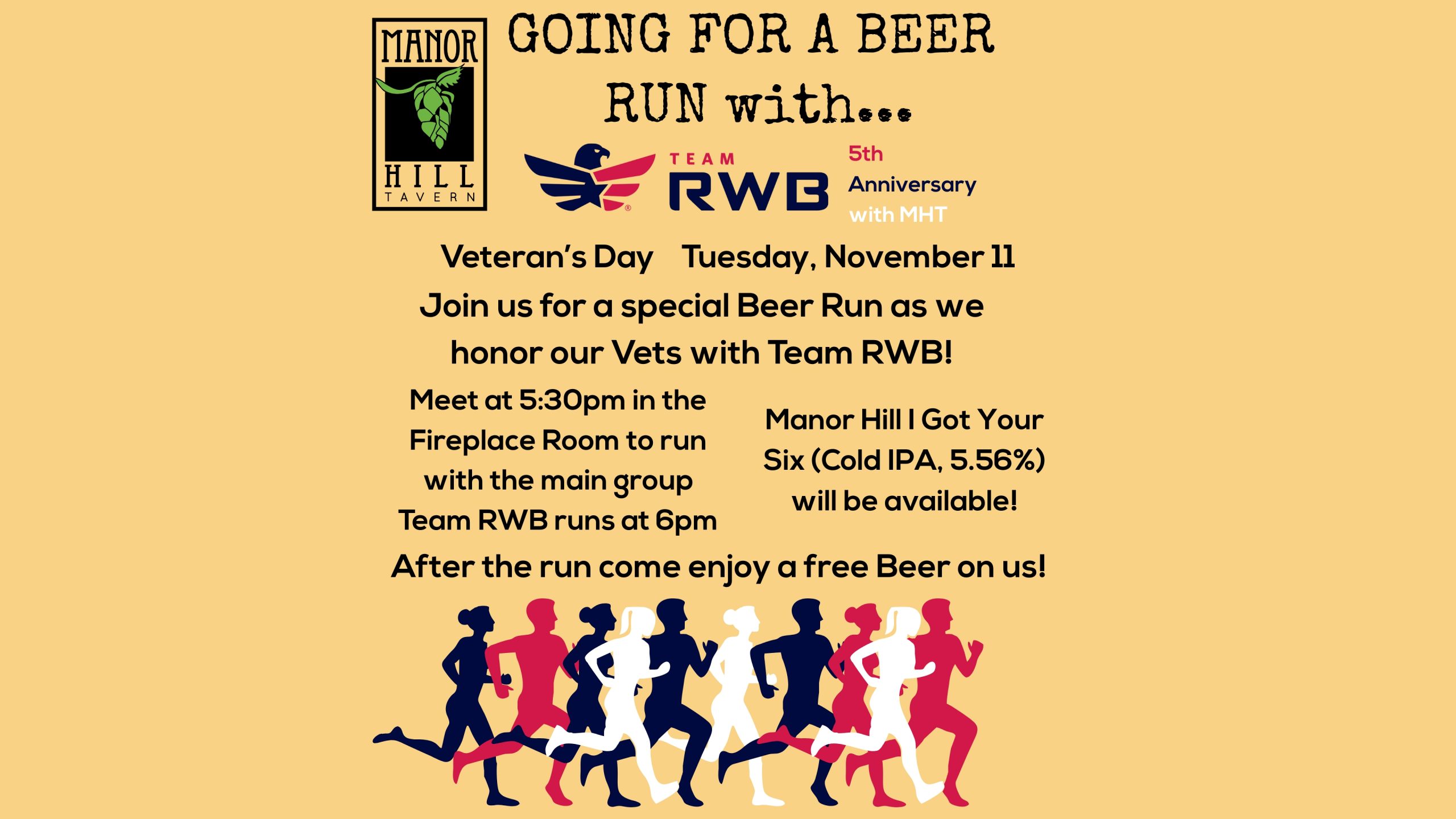 Join us this Veteran’s Day — Tuesday, November 11, as we honor Team RWB and celebrate their 5 incredible years running with us at Manor Hill Tavern!